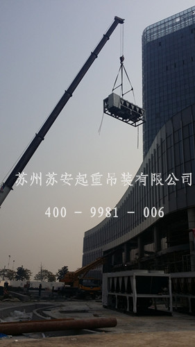 園區公積金管理中心大型空調機組吊裝。空調機組最大重8噸,需吊裝至10樓樓頂,由于有大型地下室,空調機組吊裝時吊車無法停到大樓下,蘇安吊裝公司根據現場情況,安排了一臺200噸吊車并制定出了一套安全可行的設備吊裝方案。2天時間8臺空調機組順利吊裝定位。
